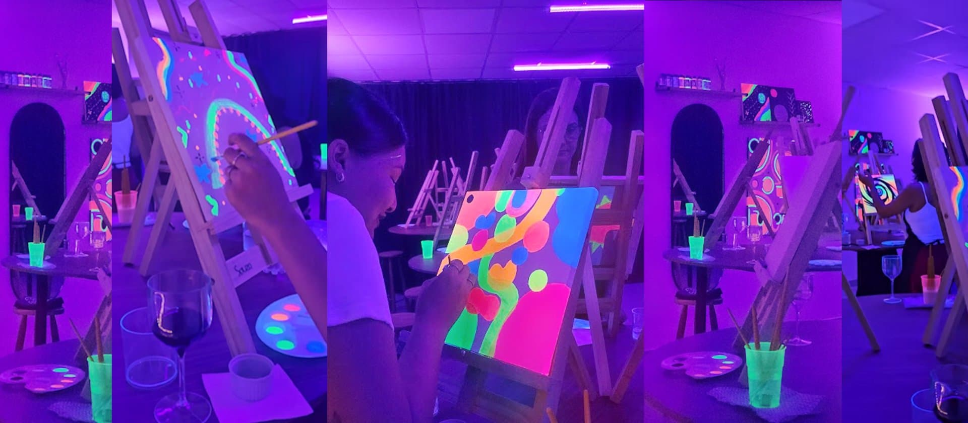 Nossas sessões Noite Neon são o carro-chefe e acontecem todas as quintas, sextas e sábados à noite. Ambiente imersivo e temático neon, com tintas fluorescentes e luz ultravioleta. São duas horas de uma experiência artística inesquecível com tudo incluso e vinhos à vontade, se quiser!